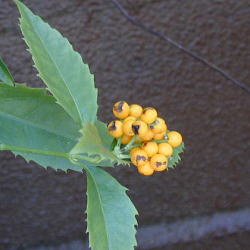 | 大きな葉に白の房状の花ですが、名前は?です。 | 黄実の千両。黄色の実もあるのですね。 | これも名前は分かりません。 |