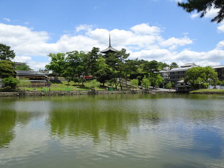 | 猿沢の池の向こうは興福寺の五重塔。 ↑マウスオンは南円堂。 | |
