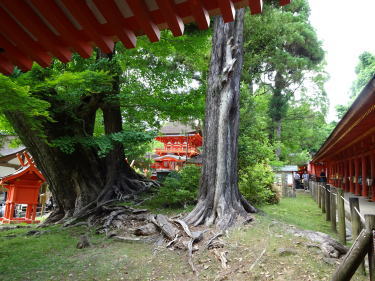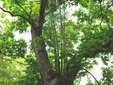 | 大きな樹木が並ぶ森です。 | ムクロジの大木の空洞を通って、竹が伸びています。 |