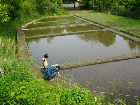 | 水をはった田んぼ。何やら親の方が夢中 | |