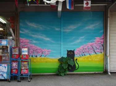 | 営業している米店の両隣は描かれたシャッター。 | |