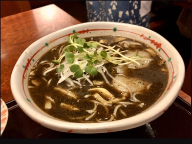 | 昼食は鎌倉峰本朝比奈店で。私は黒酢黒胡麻蕎麦をいただきました。 |