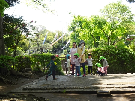 | 碑文谷公園に着きました。保育園のお散歩時間。 ↑マウスオン | |