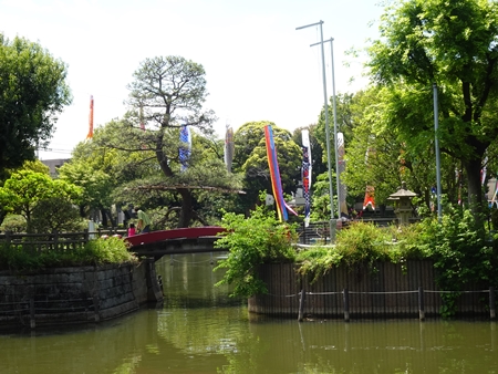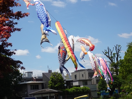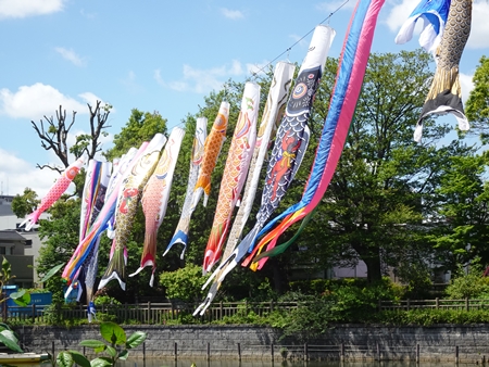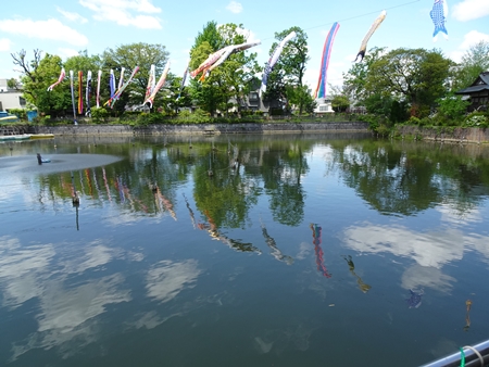 | 鯉のぼりが立っていますが、風が無く、垂れ下がり・・・ | |