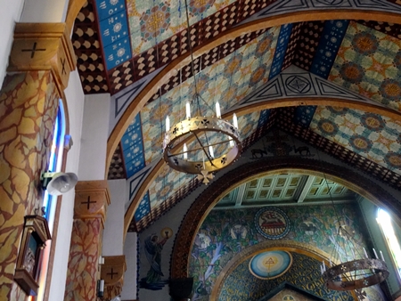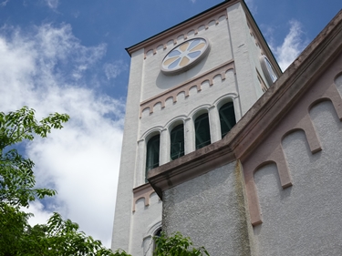 | 塔、花のマーク | ステンドグラスの窓が並びます。 |