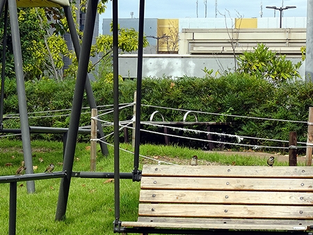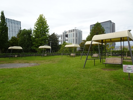 | ベンチブランコの広場 後ろにフジテレビ ↑マウスオン |