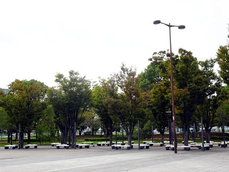 | セントラル広場のベンチの群れ ↑マウスオン |