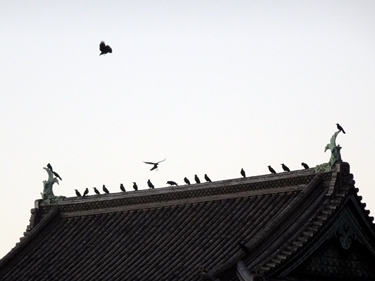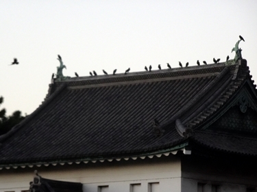 | 富士見櫓の屋根にカラスが並んでいます。 | |