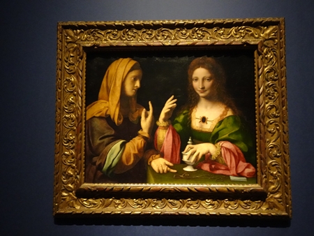 | 「マグダラのマリアの回心」 ベルナルディーノ・ルイーニ マリアがキリストに塗った香油を持ち、姉のマルタがマリアの罪深い象徴の首飾りを指さす。 |