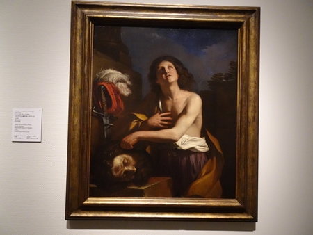 | 「ゴリアテの首を持つダヴィデ」 グエルチーノ 右手を胸にあてているのは神への感謝を示すものと考えられています。 |