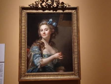 | 「自画像」 マリー=ガブリエル・カペ デッサン用のチョークホルダーを片手にイーゼルの前に晴れやかに佇んでいます。 |